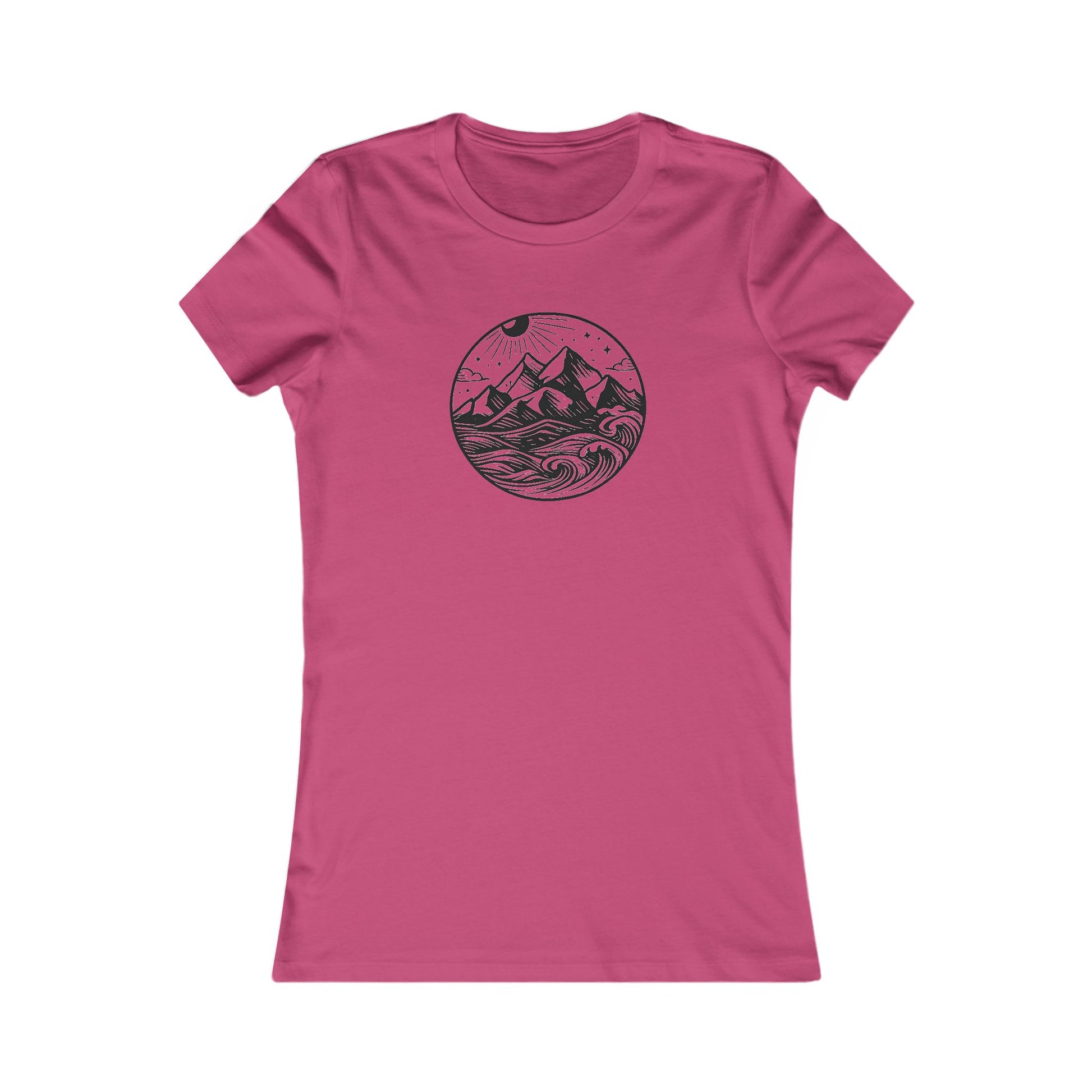 Where rugged peaks meet rolling tides — this bold circular design captures the raw beauty of land and sea in striking black line art. Featuring towering mountains, crashing waves, swaying palms, and a radiant sun on the horizon, this graphic represents freedom, strength, and the untamed spirit of the wild.